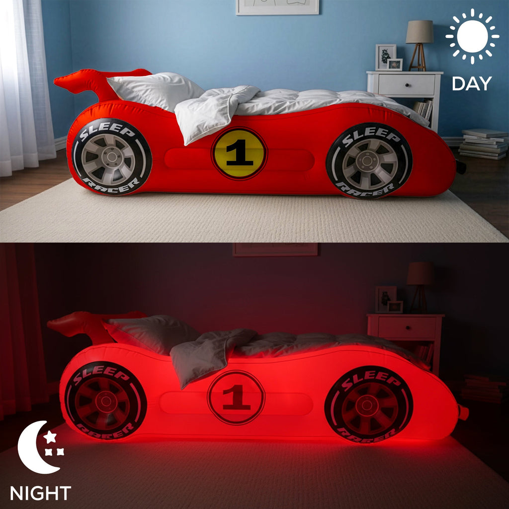 Transforme a hora de dormir em uma verdadeira corrida rumo aos sonhos com a Cama Inflável Sleep Racer™ Dream Car da AirCandy! Com design incrível de carro de corrida campeão e iluminação LED embutida, essa cama inflável infantil oferece conforto, segurança e diversão em um só produto.